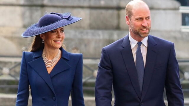 „Kate begrüßte König Charles III. mit einem Knicks und einem Kuss auf die Wange. Beim Prince of Wales, William, waren es gleich zwei Küsse auf den Wangen seines Vaters, bevor er auch die Queen Consort Camilla herzlich begrüßte.“